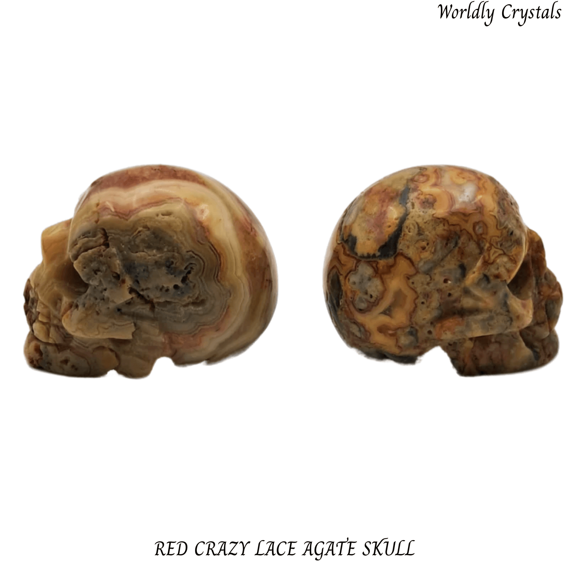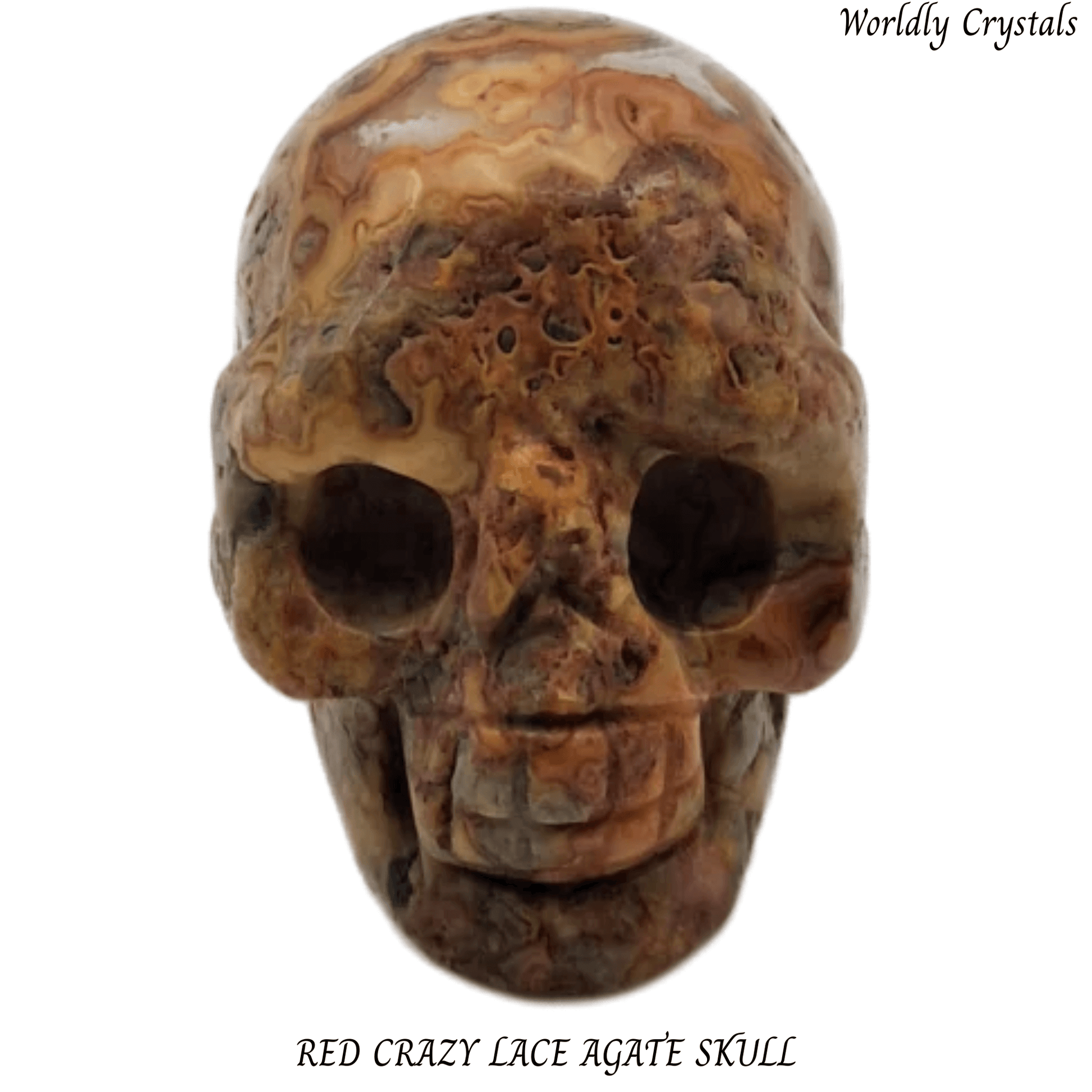 Beautifully carved Red Crazy Lace Agate crystal skull made from genuine natural stone. Each piece is unique, showcasing the natural colours and patterns of the crystal.