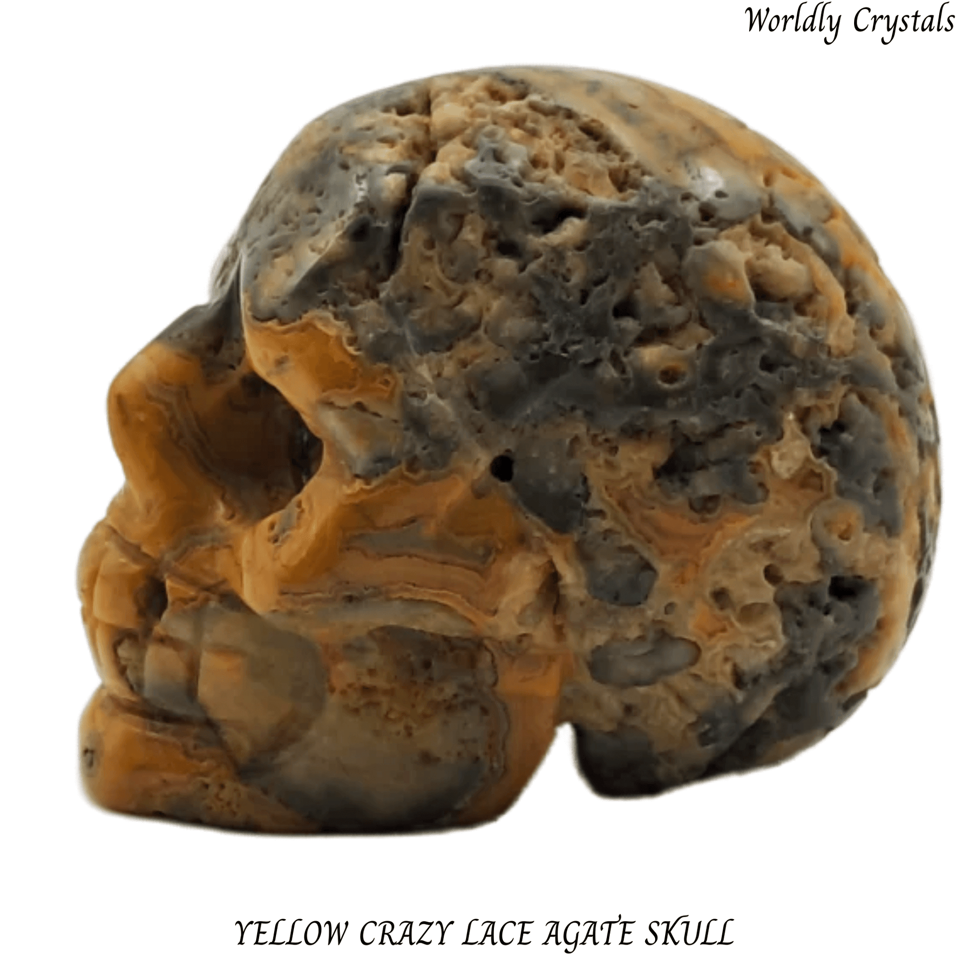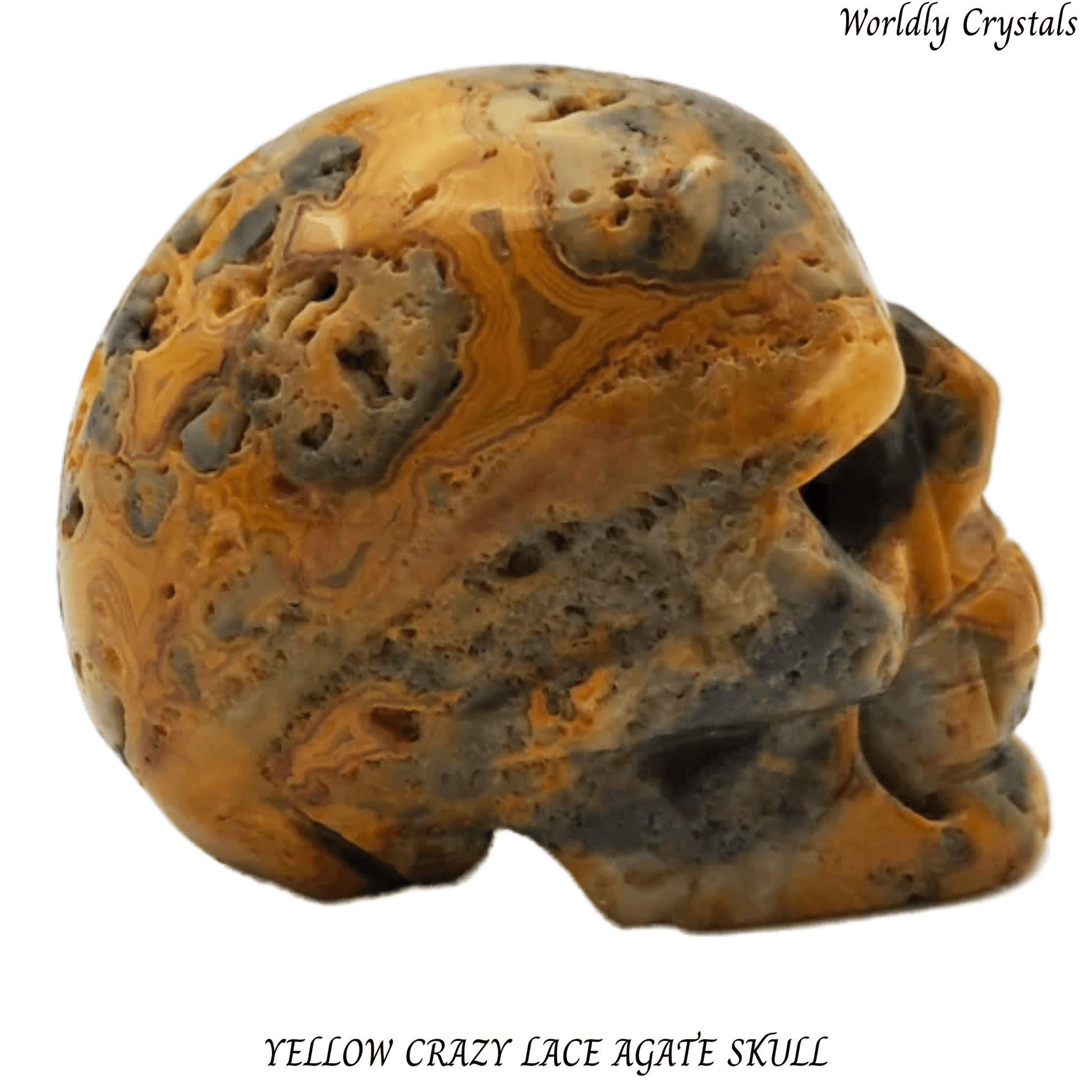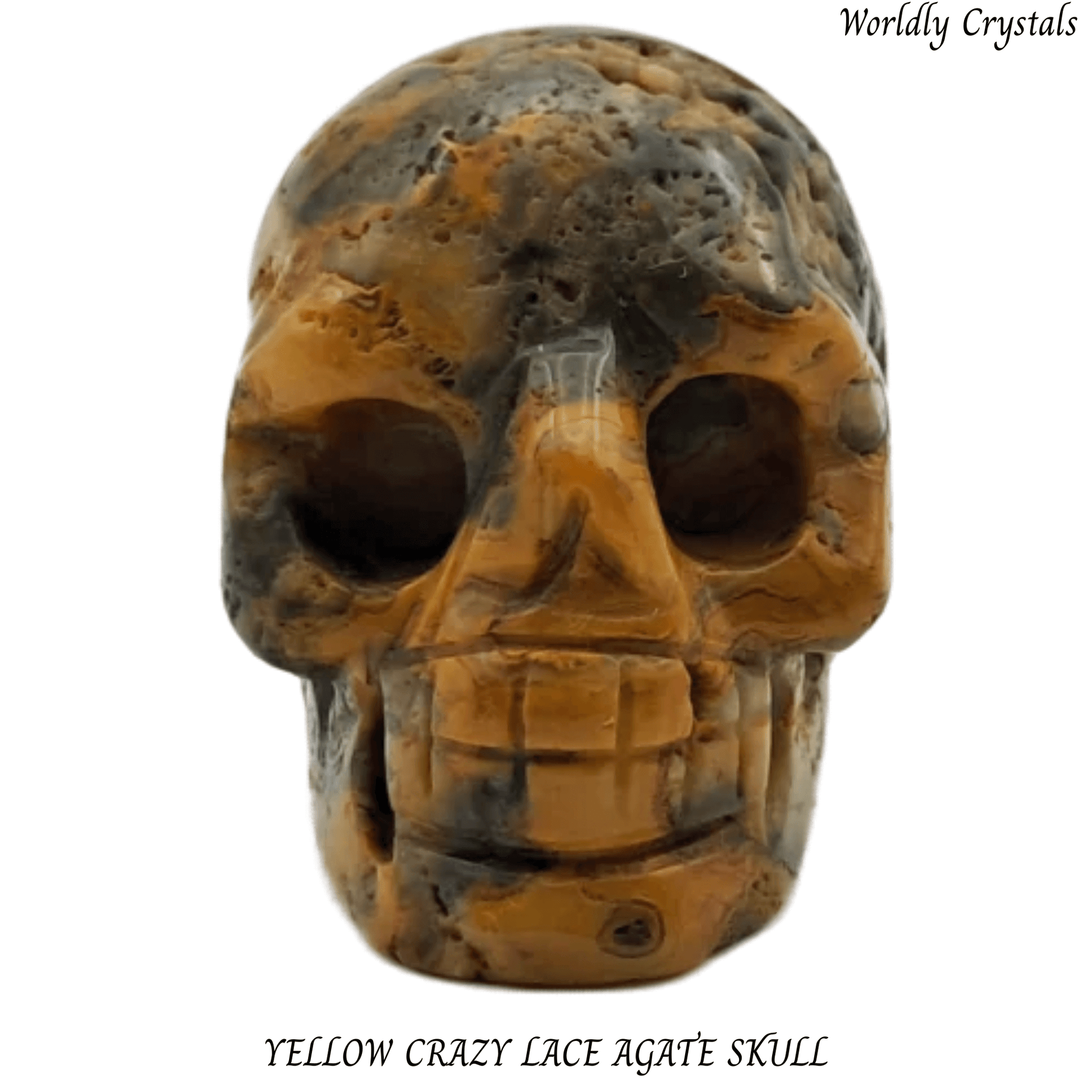 Beautifully carved Yellow Crazy Lace Agate crystal skull made from genuine natural stone. Each piece is unique, showcasing the natural colours and patterns of the crystal.
