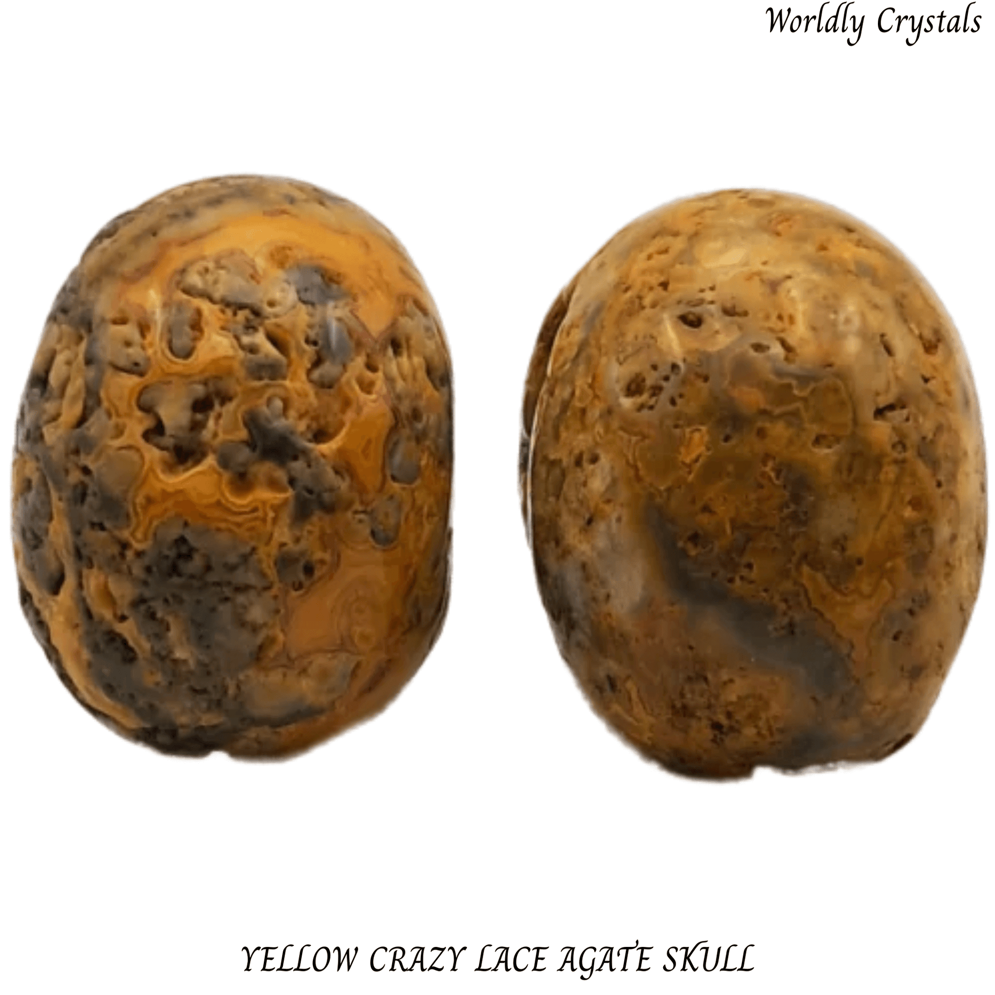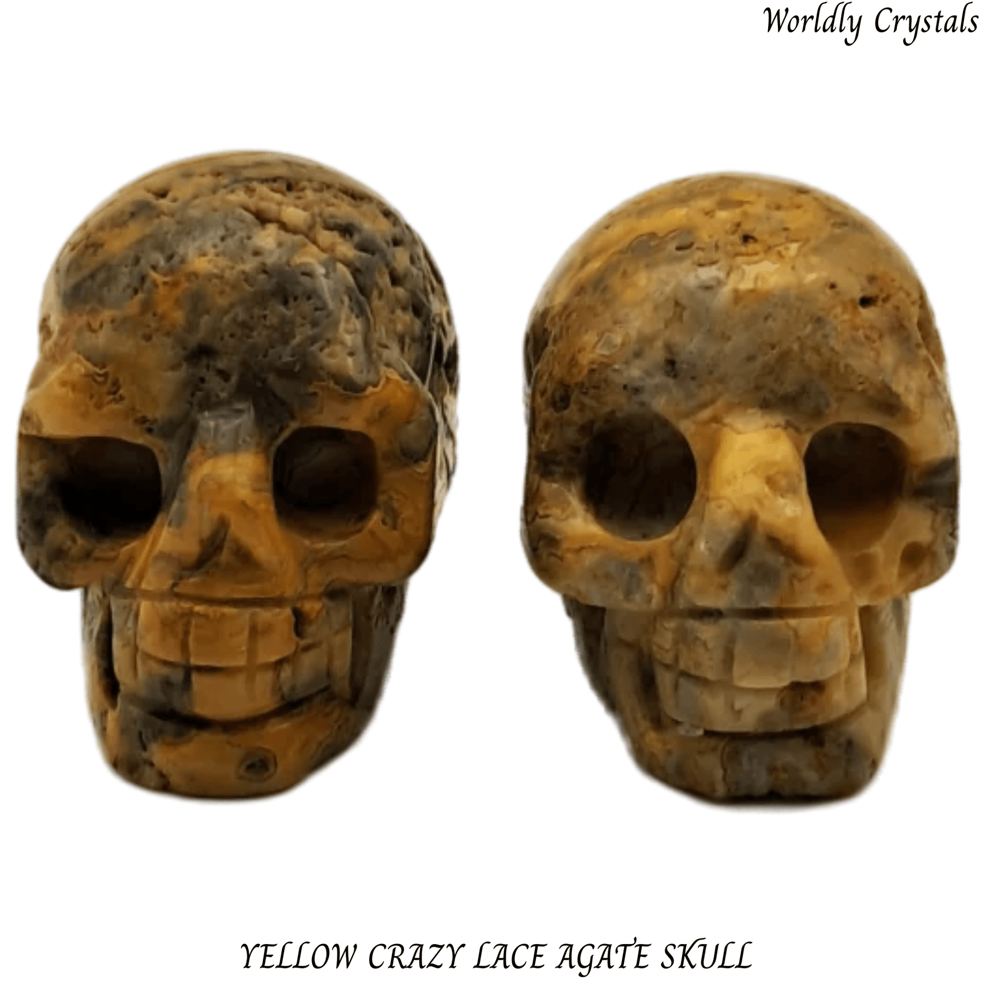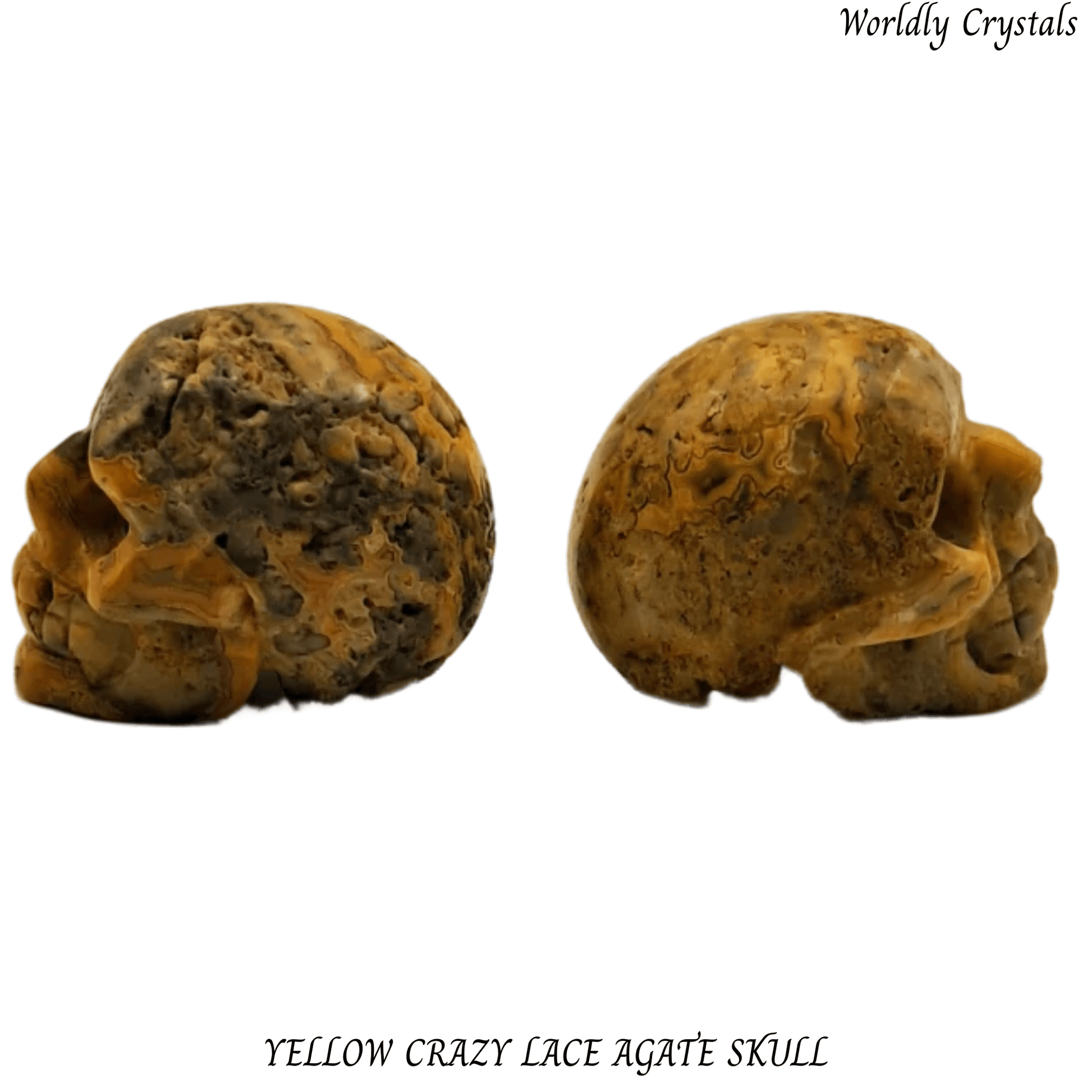 Beautifully carved Yellow Crazy Lace Agate crystal skull made from genuine natural stone. Each piece is unique, showcasing the natural colours and patterns of the crystal.