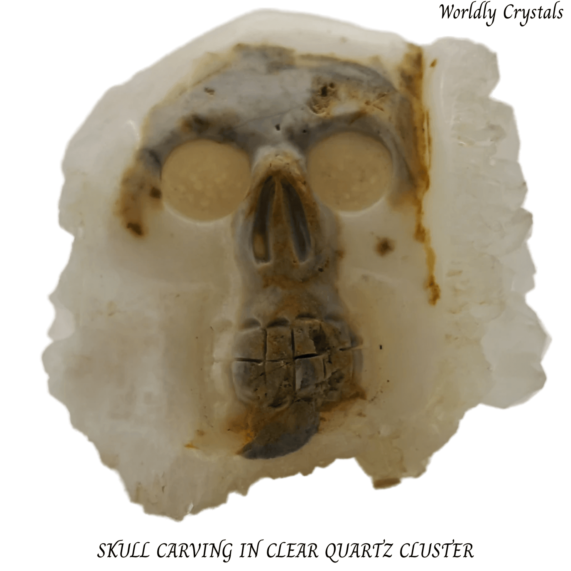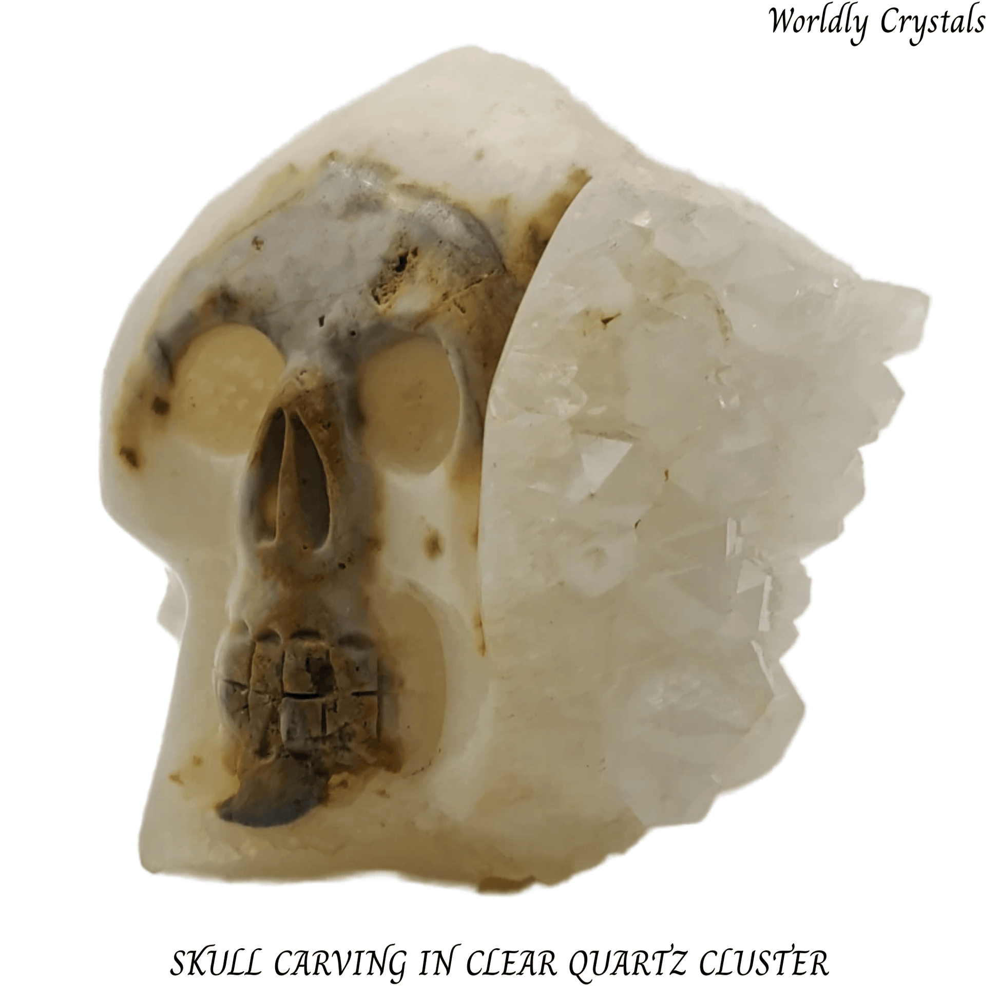 A truly one-of-a-kind piece — this Clear Quartz cluster features a finely carved crystal skull emerging from the back of the cluster itself. Each point of the quartz is beautifully clear and well-defined, creating a striking contrast with the carved detail.