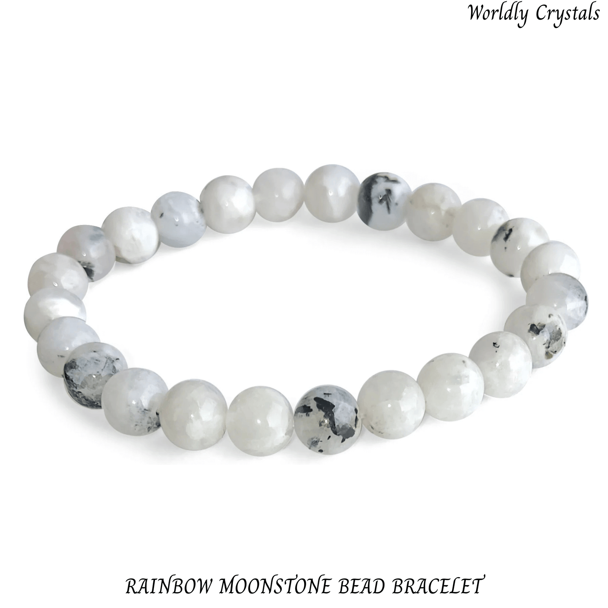 Crystal stretch bracelet made from genuine Rainbow Moonstone 8mm beads. Comfortable, natural, and ideal for everyday wear or crystal healing enthusiasts.