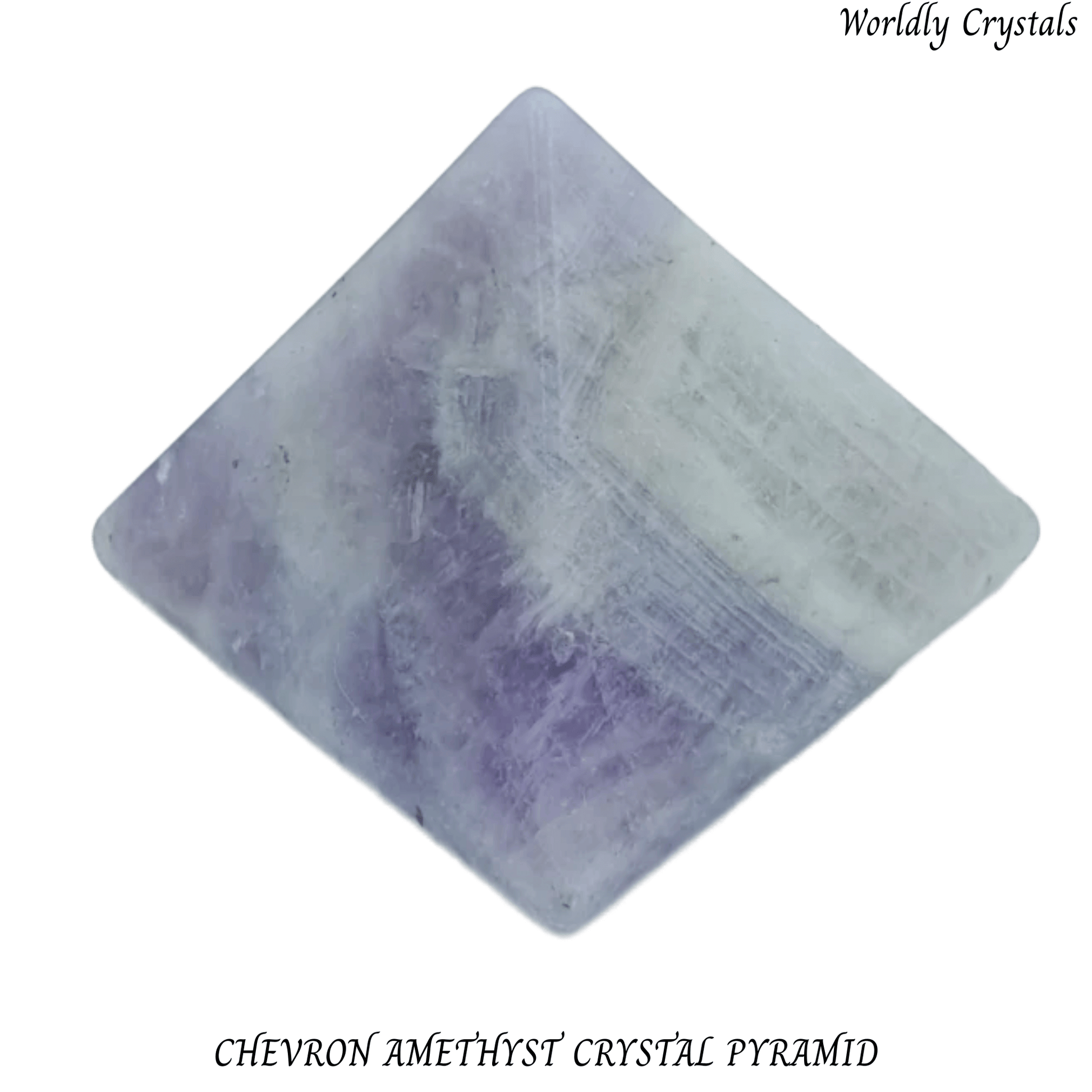 Carved Chevron Amethyst crystal pyramid made from genuine gemstone. The pyramid shape is often used in meditation and energy practices, while also serving as a striking decorative piece.