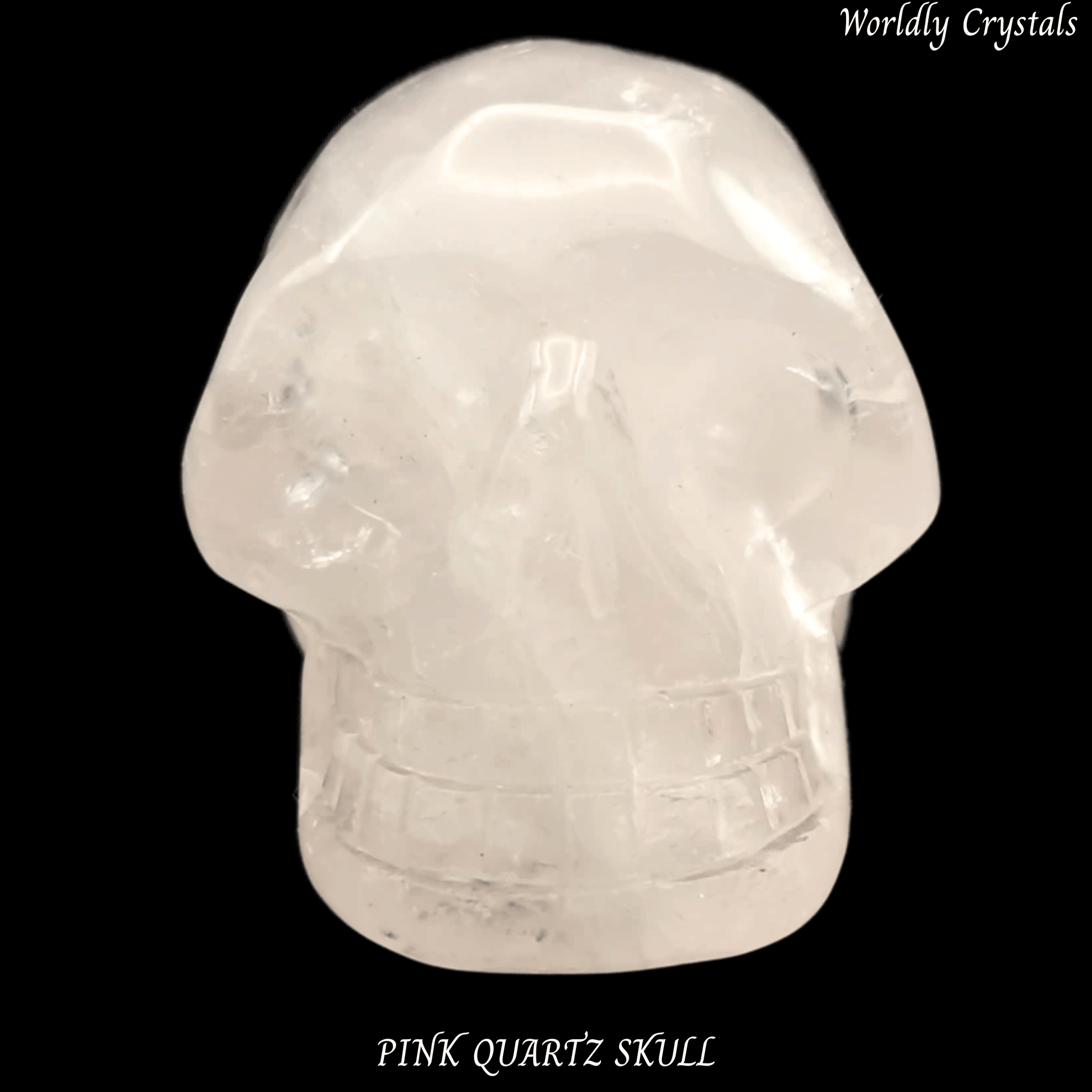 Carved Pink Quartz (light Rose Quartz) crystal skull made from genuine natural stone. Beautifully unique, showcasing the natural colours and patterns of the crystal.
